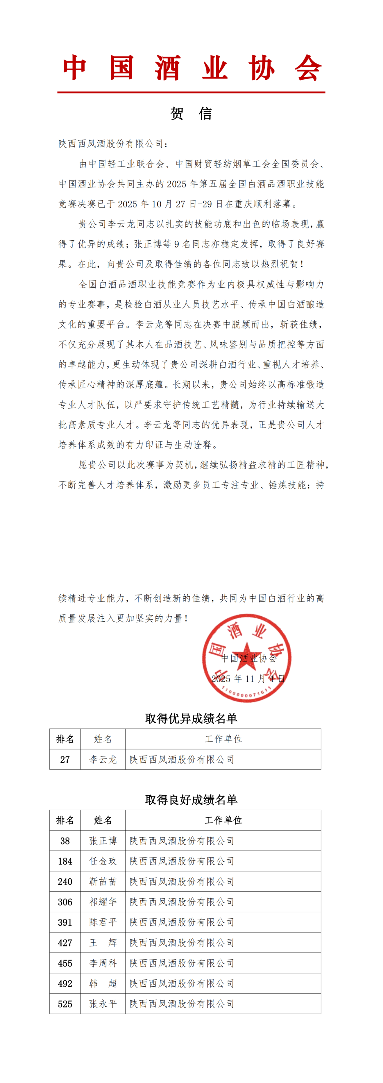 西凤集团将以本次赛事佳绩为契机,持续完善人才发展体制机制,为行业输送高素质专业人才。同时,以技术创新推动行业标准迭代,将传统酿造技艺与现代质量管理体系深度融合,探索品质提升的新路径,以卓越品质赋能产业发展。